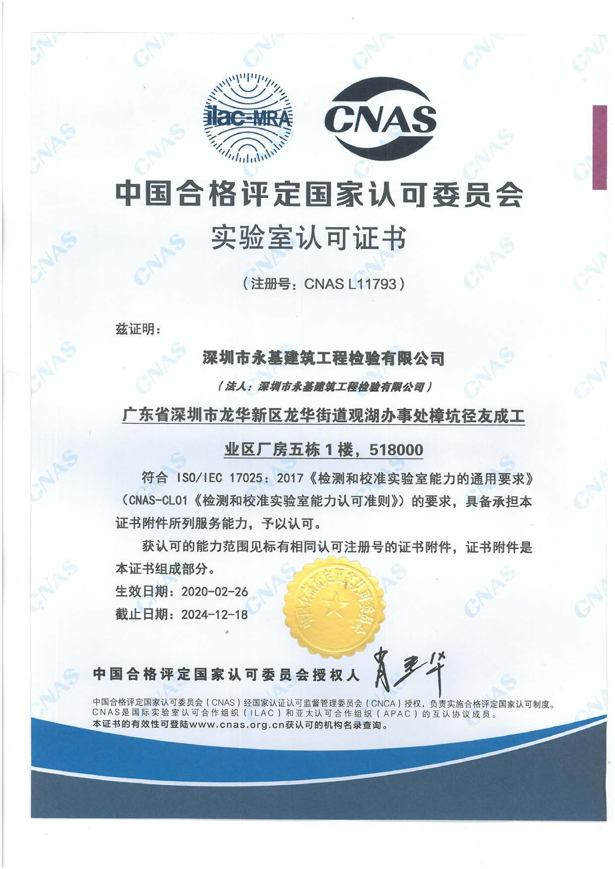 • CNAS检验机构证书